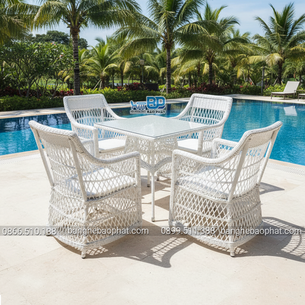 Tùy biến linh hoạt theo yêu cầu: Tại Bàn Ghế Bảo Phát, chúng tôi hiểu mỗi không gian mang một cá tính riêng. Vì vậy, chúng tôi mang đến sự linh hoạt tối đa cho khách hàng. Bạn có thể lựa chọn giữa khung sắt để tối ưu chi phí hoặc khung nhôm để có trọng lượng nhẹ và khả năng chống gỉ tuyệt đối. Đặc biệt, bạn có thể tùy chọn màu sắc của sợi mây nhựa để bộ bàn ghế hài hòa một cách hoàn hảo với phong cách thiết kế chung của mình.