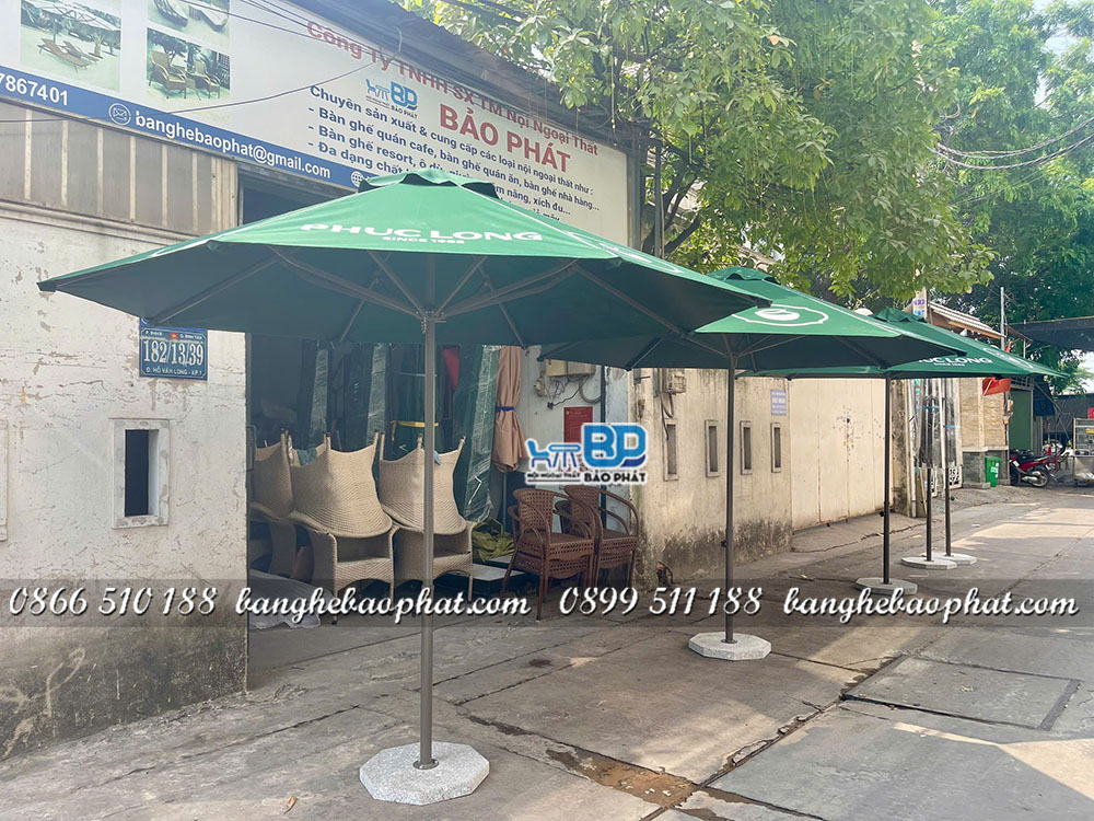 Dù che Phúc Long màu xanh trà sữa là sự lựa chọn hoàn hảo để kiến tạo không gian ngoại thất sang trọng và vô cùng thoáng mát. Sản phẩm hội tụ đầy đủ độ bền vững từ khung sắt sơn tĩnh điện sự vững chãi của đế đá tự nhiên và khả năng chống thấm tuyệt đối từ vải bạt. Đầu tư vào mẫu thiết bị che chắn này tại Bảo Phát giúp bạn bảo vệ khách hàng trọn vẹn và nâng cao hiệu quả kinh doanh.